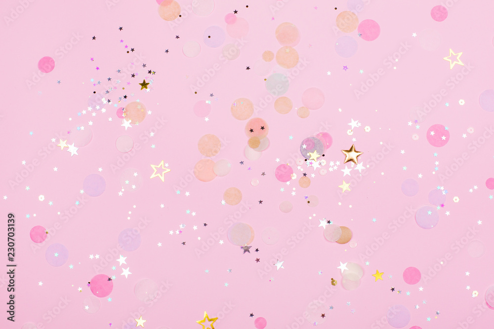 Pink pastel festive background with confetti and sparkles. Flat lay style.