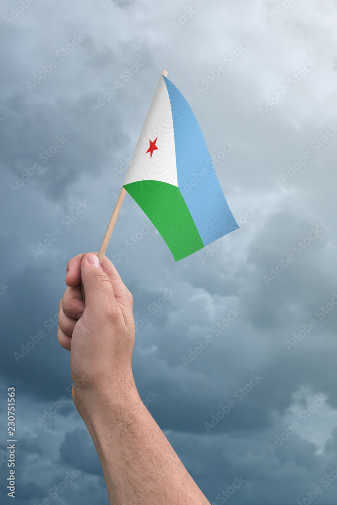 Hand holding Djibouti flag high in the air, with a stormy, cloudy sky