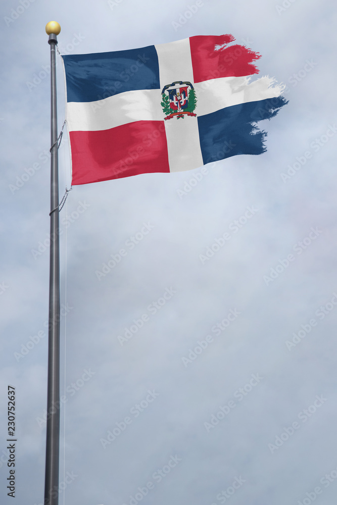 Worn and tattered Dominican Republic flag blowing in the wind on a cloudy day