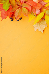Bright Autumn leaves on orange background. Flat lay, top view, copy space