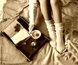 Cozy fall indoor female with woolen socks, coffee and candle, soft cozy bed blanket