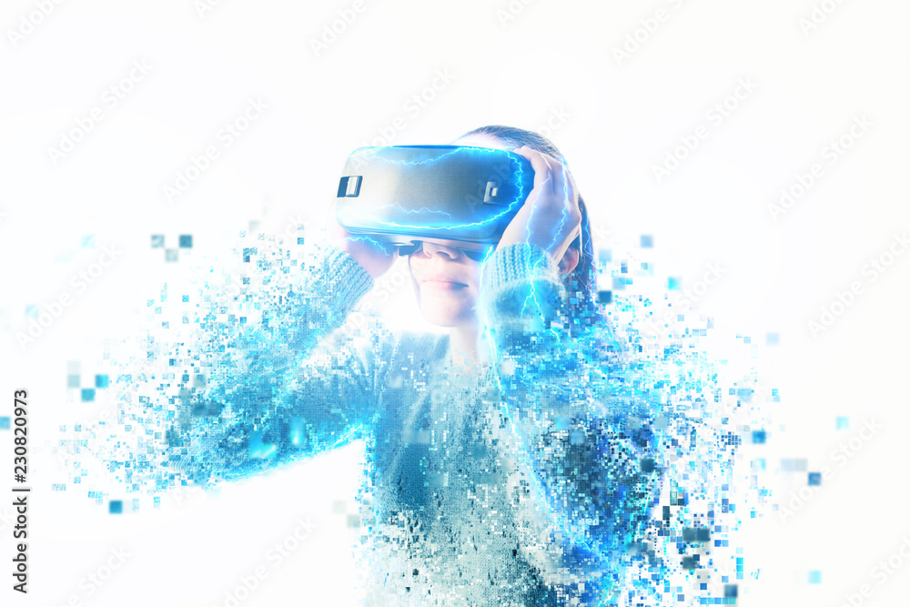 A person in virtual glasses flies to pixels. Future technology concept. Modern imaging technology.