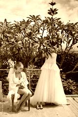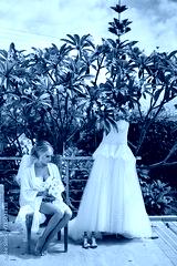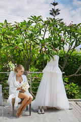 Beautiful, busty and fashionable blonde model girl with sexy body in a white peignoir and in lingerie, with the bouquet of flowers in her hands, sits on a chair and enjoying the sun outdoors