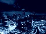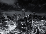 Aerial drone black and white cityscape of the capital city of Denver Colorado at night