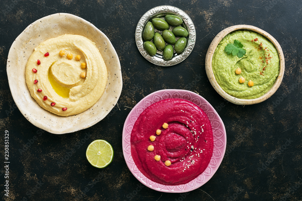 A variety of colored hummus, classic hummus, beet hummus, hummus with avocado on a dark rustic background. Top view, flat lay. Clean eating, dieting, vegetarian party food