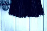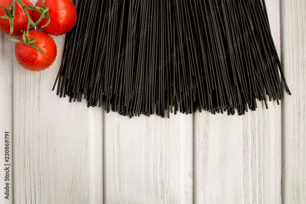 Black spaghetti and cherry on the grey wooden background.Top view.Copy space.