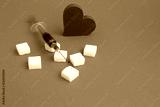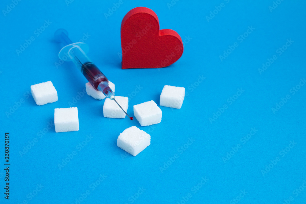Syringe with blood, sugar and red heart on the blue background.Copy space.