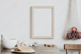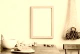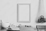 Vintage kitchen interior with mock up photo frame, straw basket, natural bread and bag with apples. Minimalist concept of kitchen space.