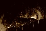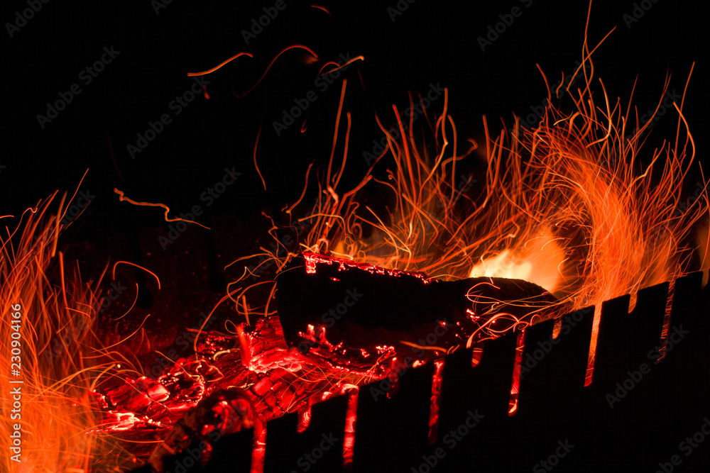 Burning firewood in the fireplace, coal background. Coal fire with sparks