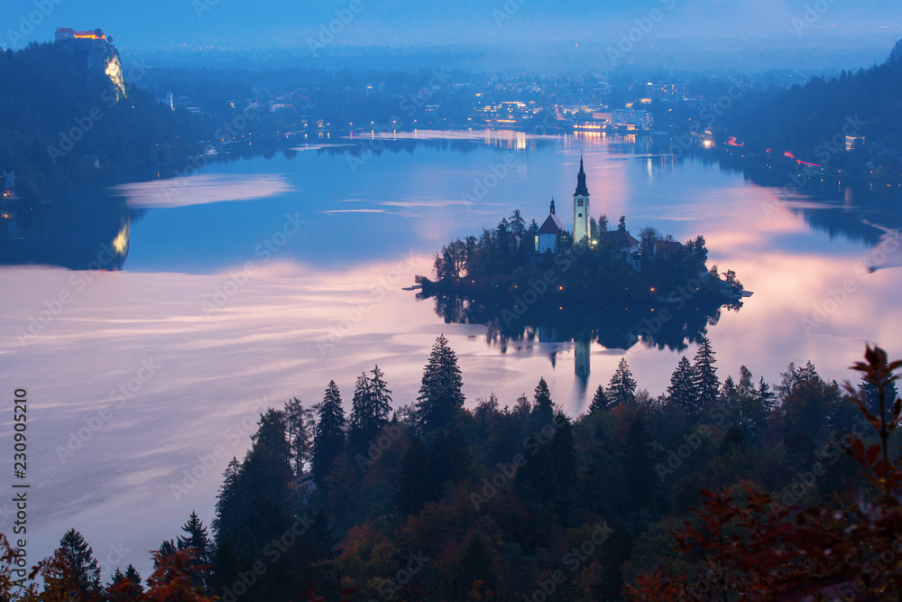 Panoramic view of amazing Bled Lake in Slovenia in autumn time with beautiful clouds in background.