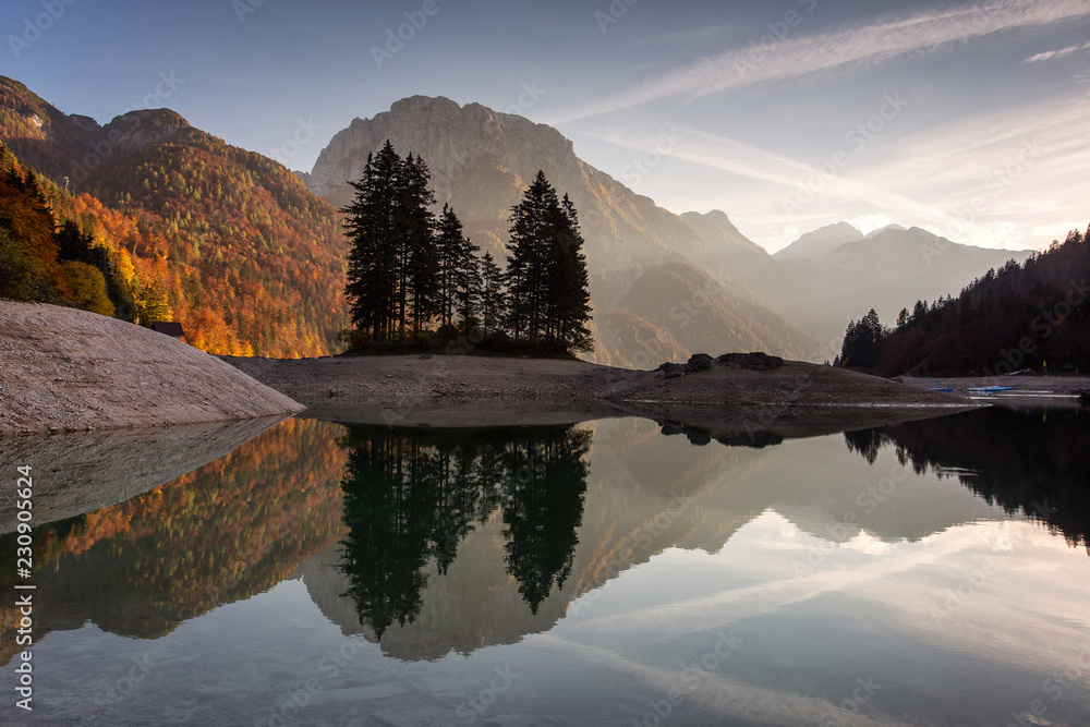 Beautiful reflection at Lake Predil, Italy with colorful trees in background in autumn season