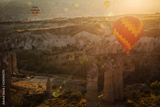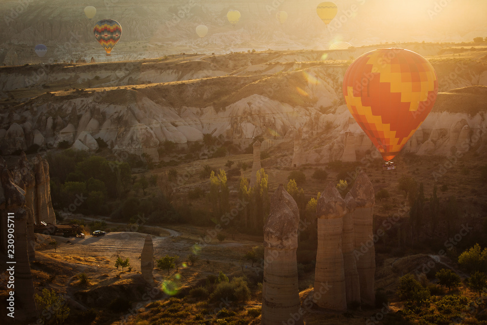 Landscaoe with colorful balloons at sunrise over love valley in Cappadocia, Turkey.