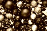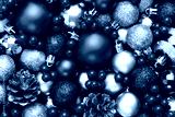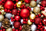 Christmas and New Year's composition. Top view of Christmas ball, pine cones and red berries as background.
