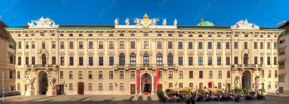 Der Reichskanzleitrakt in der Wiener Hofburg bei Sonnenschein mit Besuchern