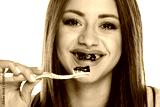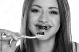 young woman brushing her teeth with black active charcoal toothpaste on white background