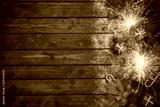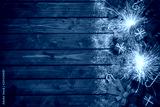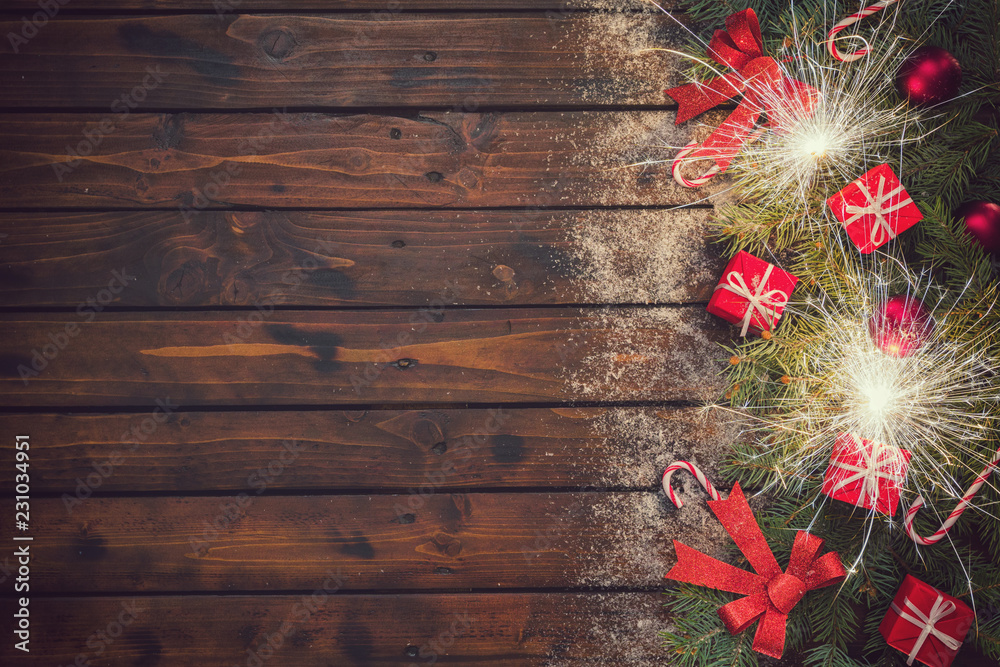 Christmas garland with ornaments on the old wooden background