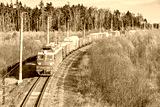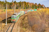 Long freight train approaches to the station at autumn day time.