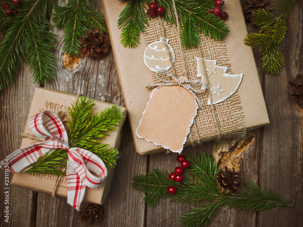 Christmas letter, list, congratulations on a wooden background. free space, mockup new Year. Spruce branches and decoration with their own hands. Cheap greetings