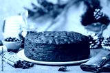 Christmas fruit cake, pudding on white plate. Copy space. Close up.