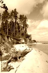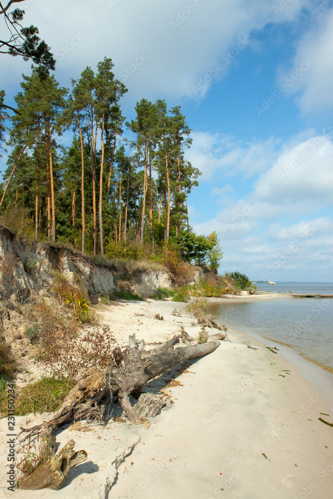 Steep sandy beach and pine forest on the shores of the sea or lake.