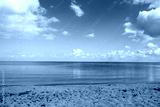 Big clouds reflecting on the smooth water surface. Warm autumn day near the lake or a sea. Sandy shore near the water on a windless day.