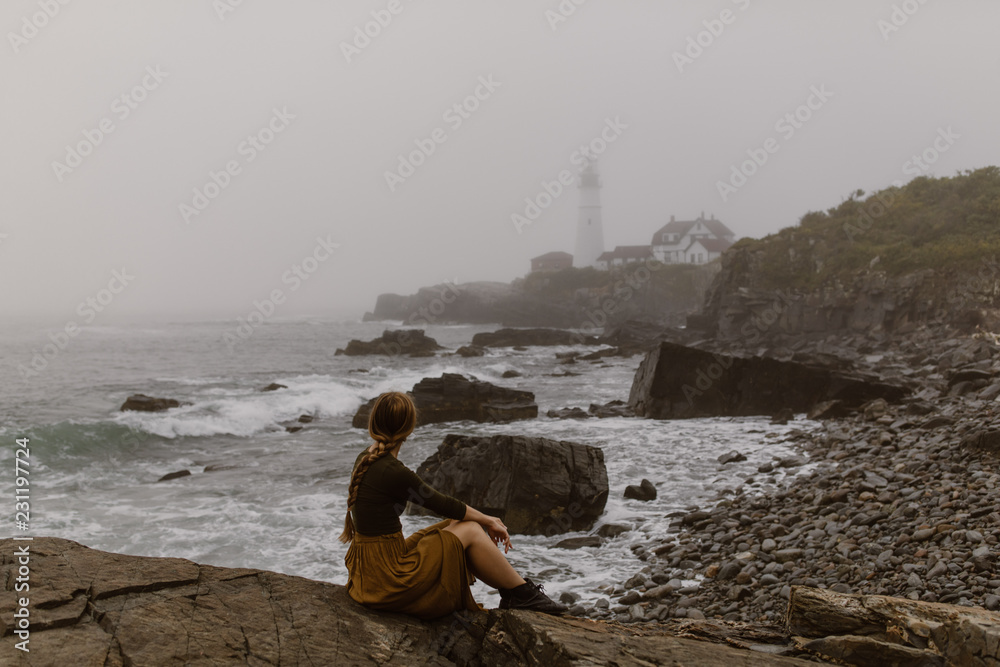 woman walking along a foggy coast with lighthouse