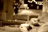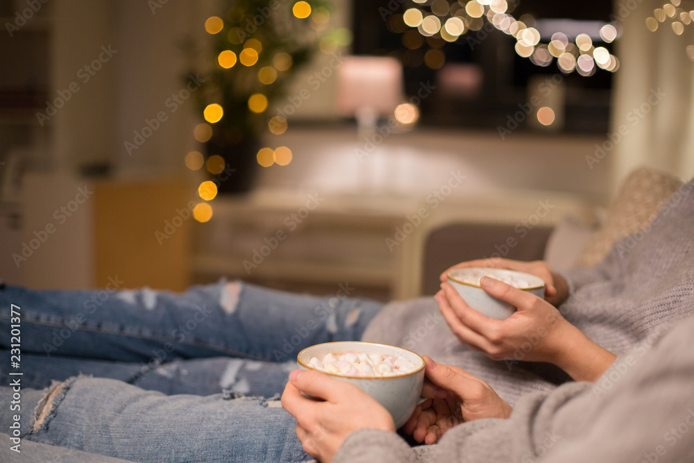 hygge, leisure and christmas concept - close up of couple drinking hot chocolate with marshmallow at home