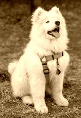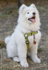 Samoyed Dog Puppy Female Sitting and Looking Up. Off-leash Park in Northern California.