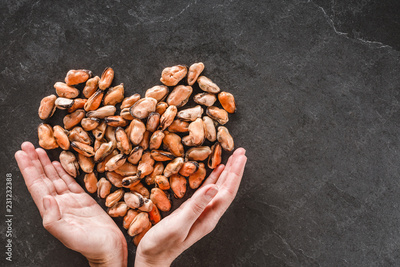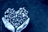 Hands holding frozen peeled mussels in shape of heart over slate stone background. Seafood, top view, flat lay, copy space