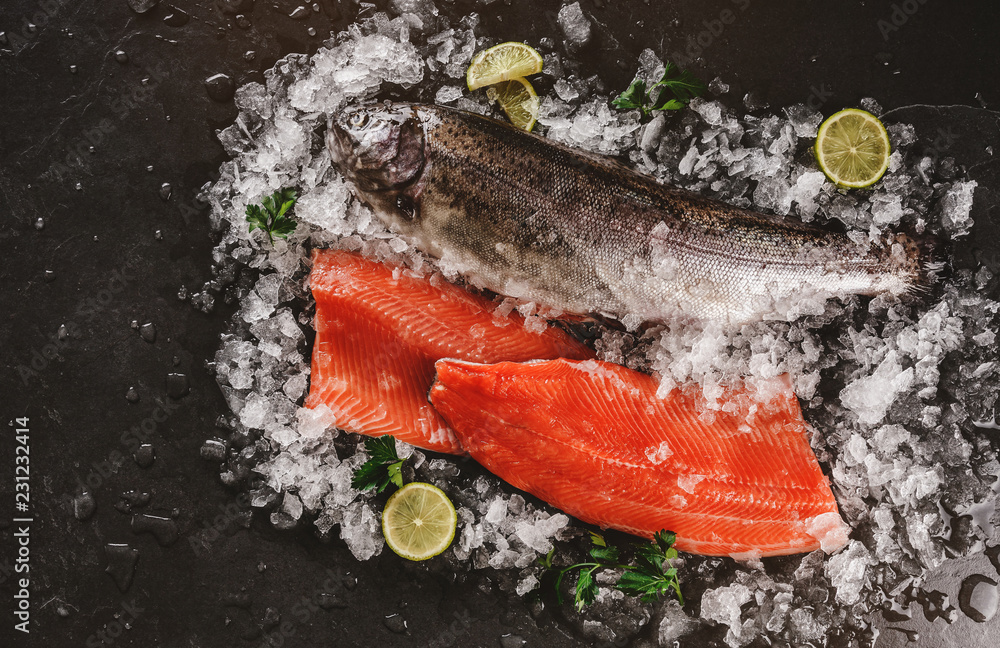 Fresh raw trout fish steak and whole fish with spices on ice over dark stone background, closeup