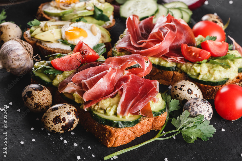Various of sandwiches and bruschetta with prosciutto, fried quail egg, avocado, cucumber, tomatoes, spices on stone background