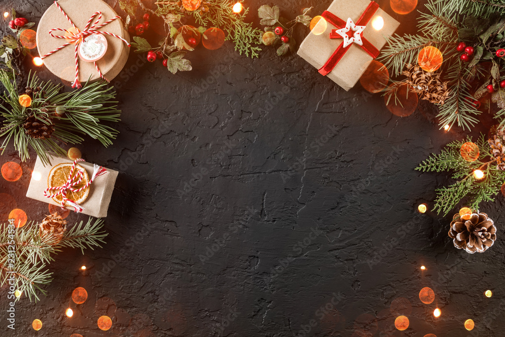 Christmas gift boxes on holiday background with Fir branches, pine cones. Xmas and Happy New Year theme, bokeh, sparking, glowing.