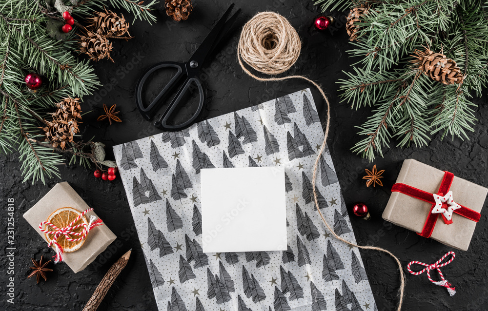 Christmas composition with letter, xmas wrapping, Fir branches, gifts, pine cones, red decorations, scissors on holiday background