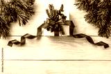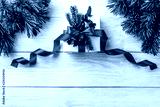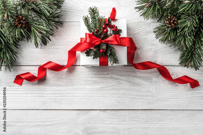 Christmas gift box with red ribbon on white wooden background, frame of fir branches, pine cones. Xmas and Happy New Year