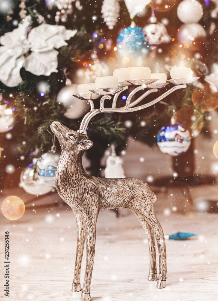 Christmas deer and Christmas tree background with decorations, snow, blurred, sparking, glowing. Happy New Year and Xmas theme