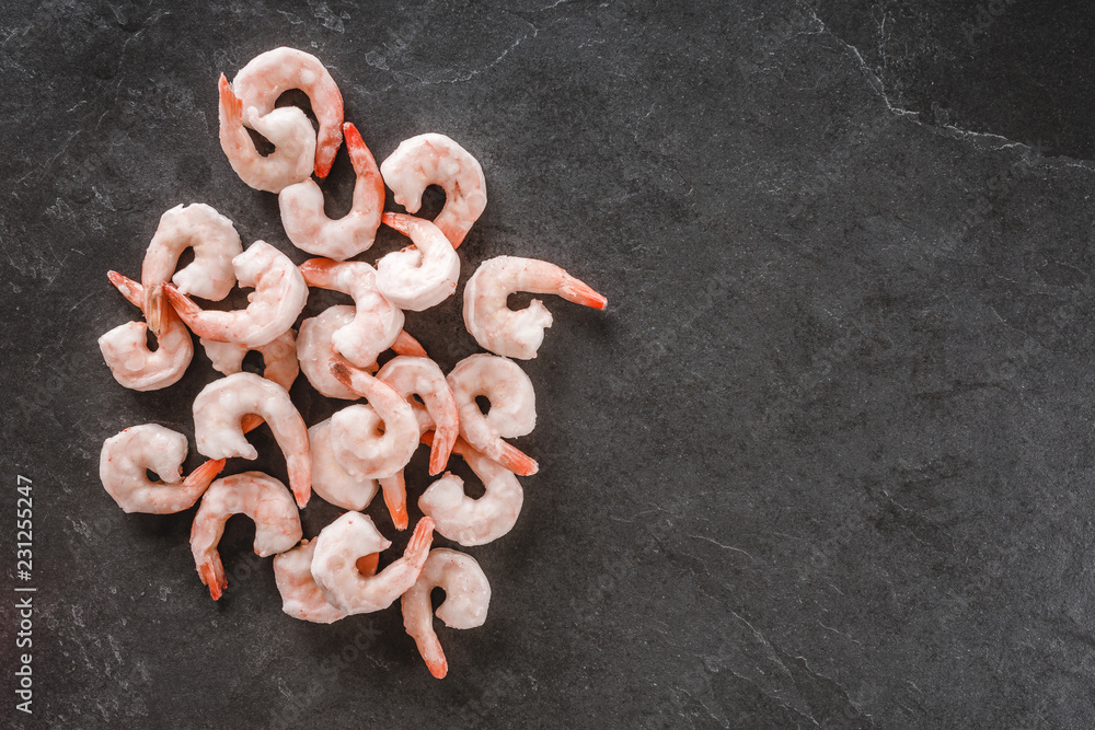 Fresh shrimps or prawn with ice on slate stone background. Seafood, top view, flat lay, copy space