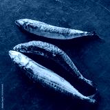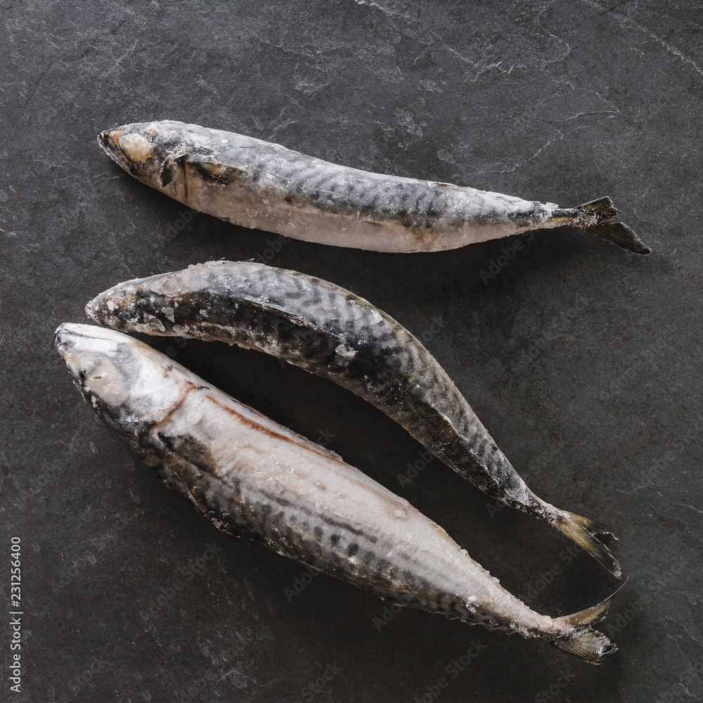 Frozen mackerel fish or sea bream on slate stone background. Seafood, top view, flat lay, copy space