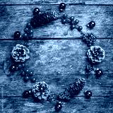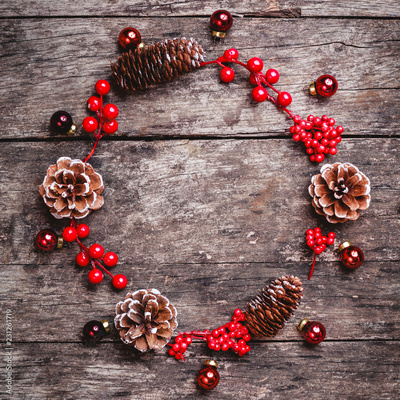 Christmas wreath of Fir branches, cones, red decorations on dark wooden background. Xmas and Happy New Year composition. Flat lay, top view