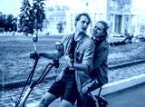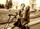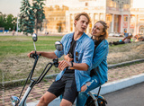 Lovely young couple driving electric bike during summer. Modern city dating and transportation