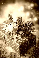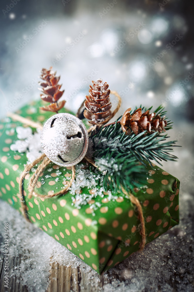 Merry Christmas and happy New year. Christmas gift and Christmas tree on dark wooden background.
