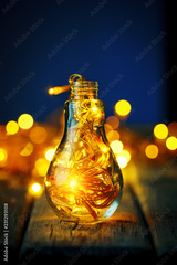 Merry Christmas and happy New year. Christmas garland in a glass jar on a wooden table. Selective focus.