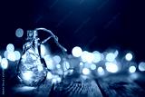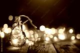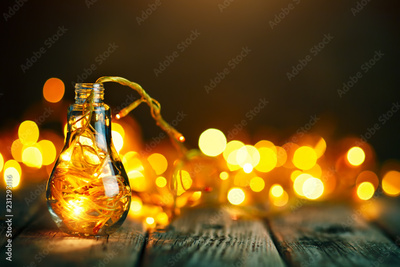Merry Christmas and happy New year. Christmas garland in a glass jar on a wooden table. Selective focus.