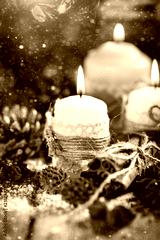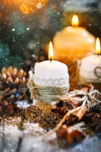 Merry Christmas and happy New year. Candle and Christmas toys on a wooden table. Bokeh. Selective focus.