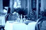 Small table set for dinner in outdoor cafe in Little Italy neighborhood in downtown Manhattan, New York City