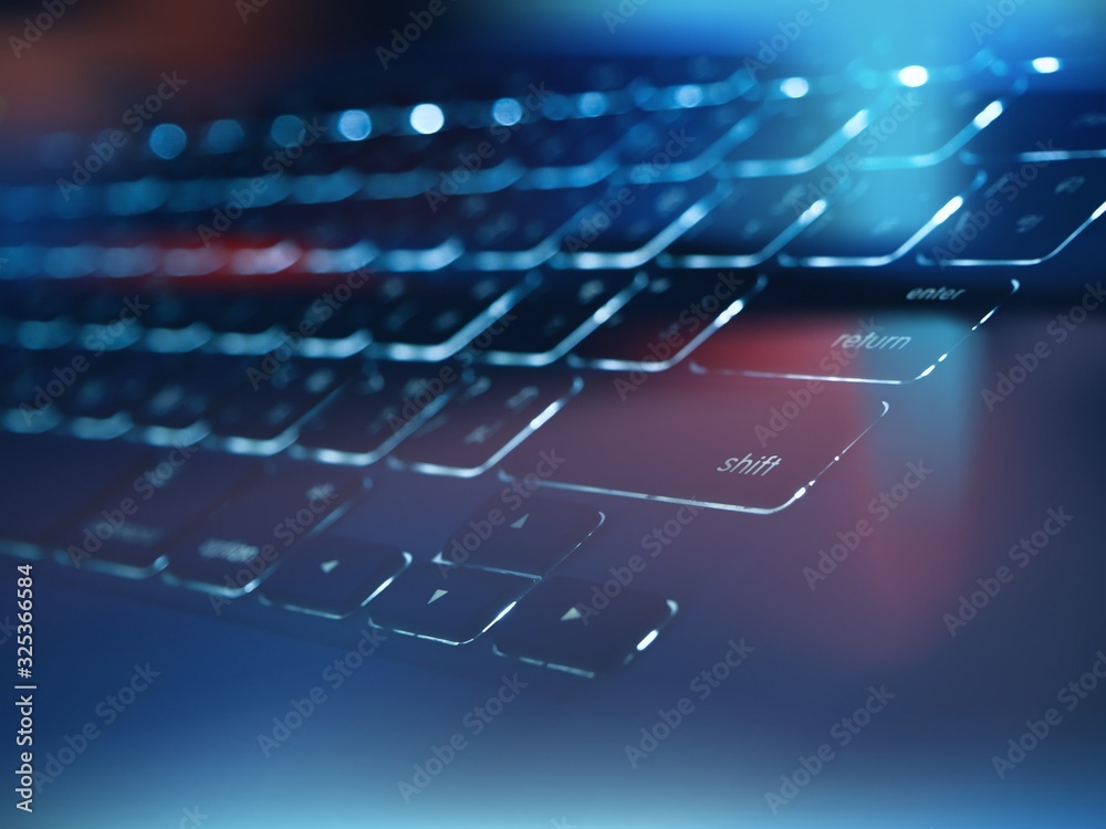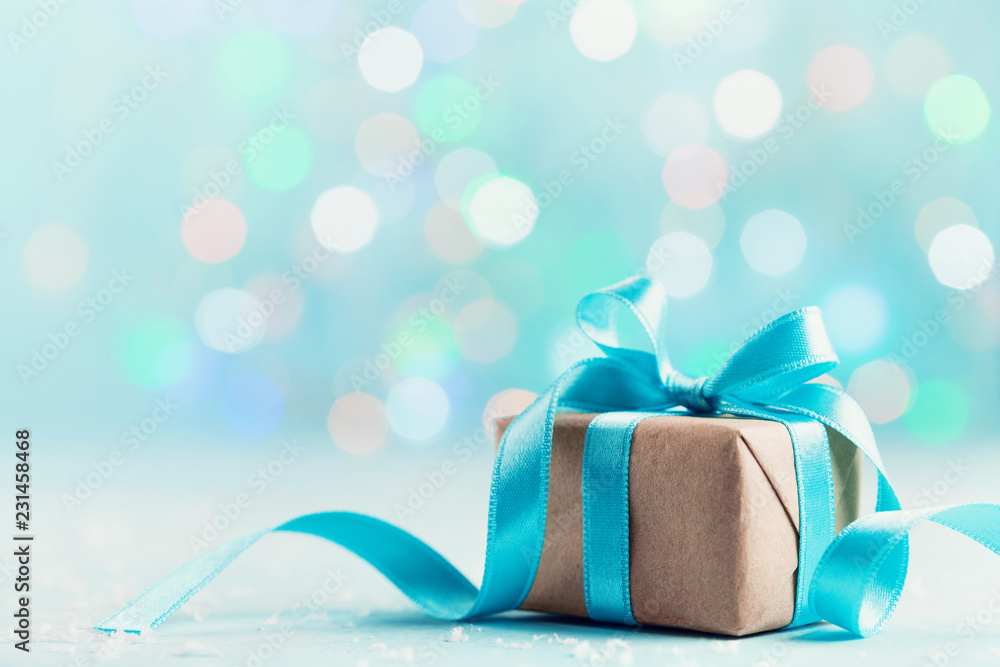 Christmas gift box against blue bokeh background. Holiday greeting card.
