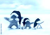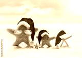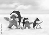 Family of starfish on summer beach and Santa hat. Merry Christmas