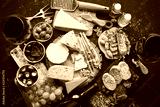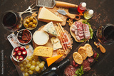 Huge assortment of various tasety spanish, french or italian apertizers. Cheese, meat, olives, stuffed peppers, bread, sticks. Placed on rusty dark background. View from above.
