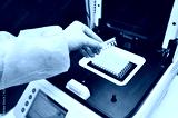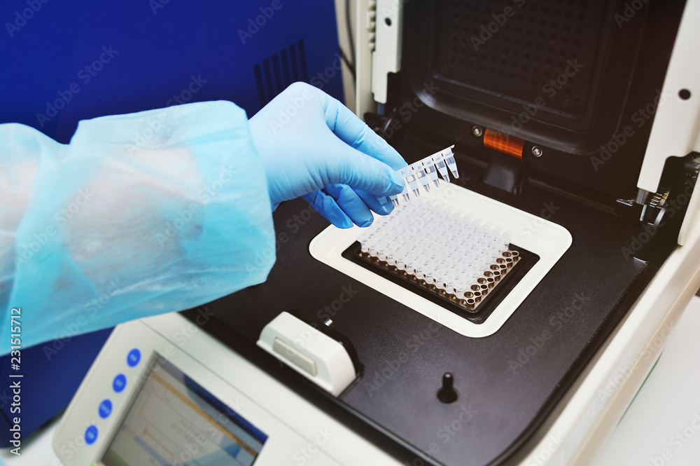 Thermocycler for DNA and PCR tests and analyzes against the backdrop of a medical laboratory