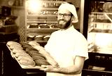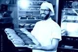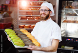 young cute Baker in white uniform holding a tray with colored rolls for hot dog on the background of bakery or bread factory