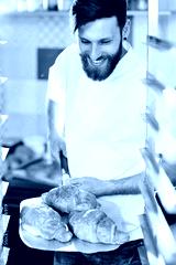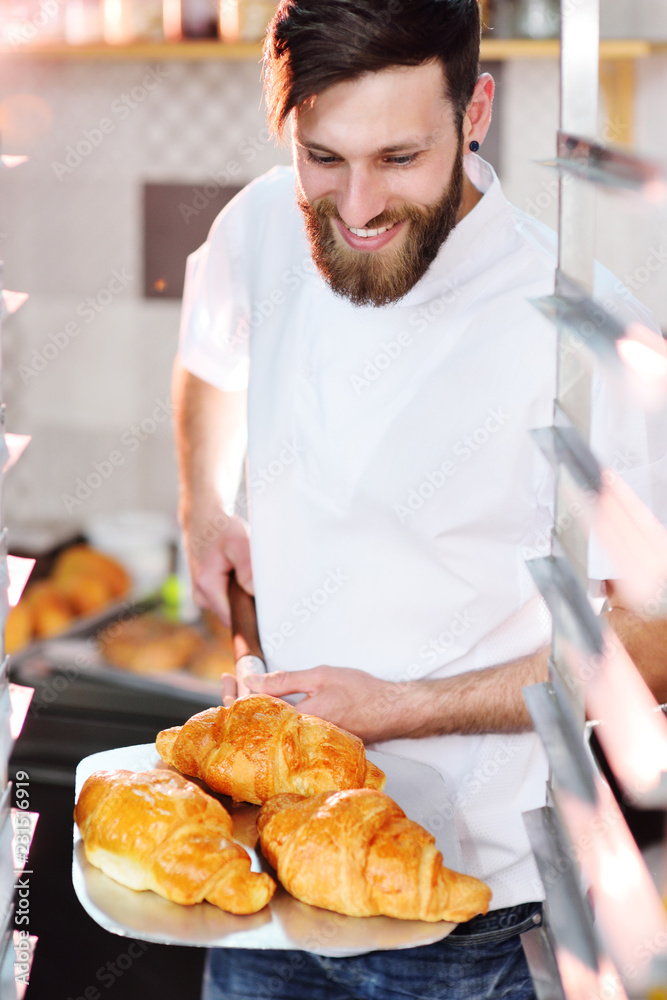 Handsome baker in white uniform holding in his hands a tray full of freshly baked croissants against the background of a bakery